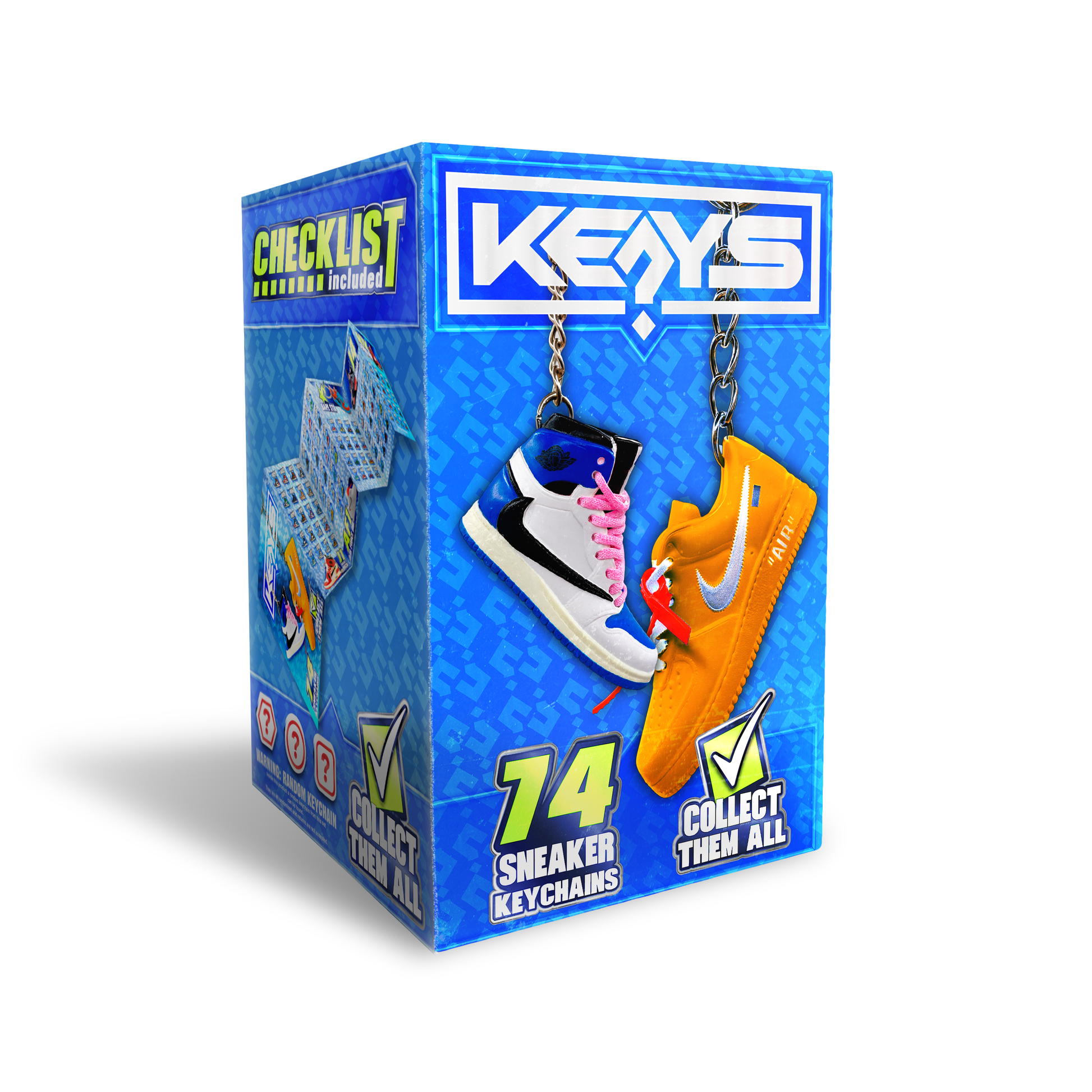 Dentro de cada caixa vem 1 modelo mistério entre 74 sneakers diferentes e uma checklist para ires marcando a tua coleção, trocar com amigos e tentar completar o set.